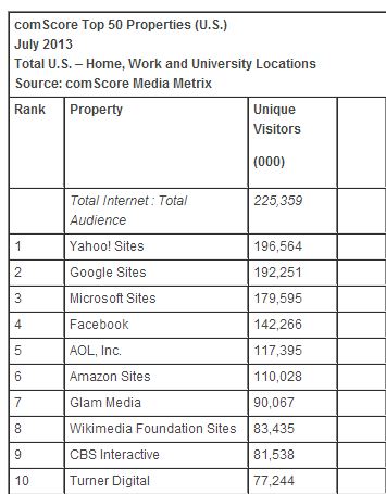 Microsoft, con toda su familia web, y Facebook acompañan a Yahoo y Google en la lista, que continúa en el informe oficial hasta llegar al puesto 20, con Linkedin, y al 30 con Twitter.